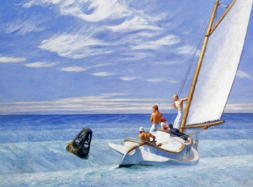 이들의 시선은 캔버스 밖의 다른 곳을 향하지 않고 한곳에 집중되어 배와 부표를 이어주는 역할을 한다