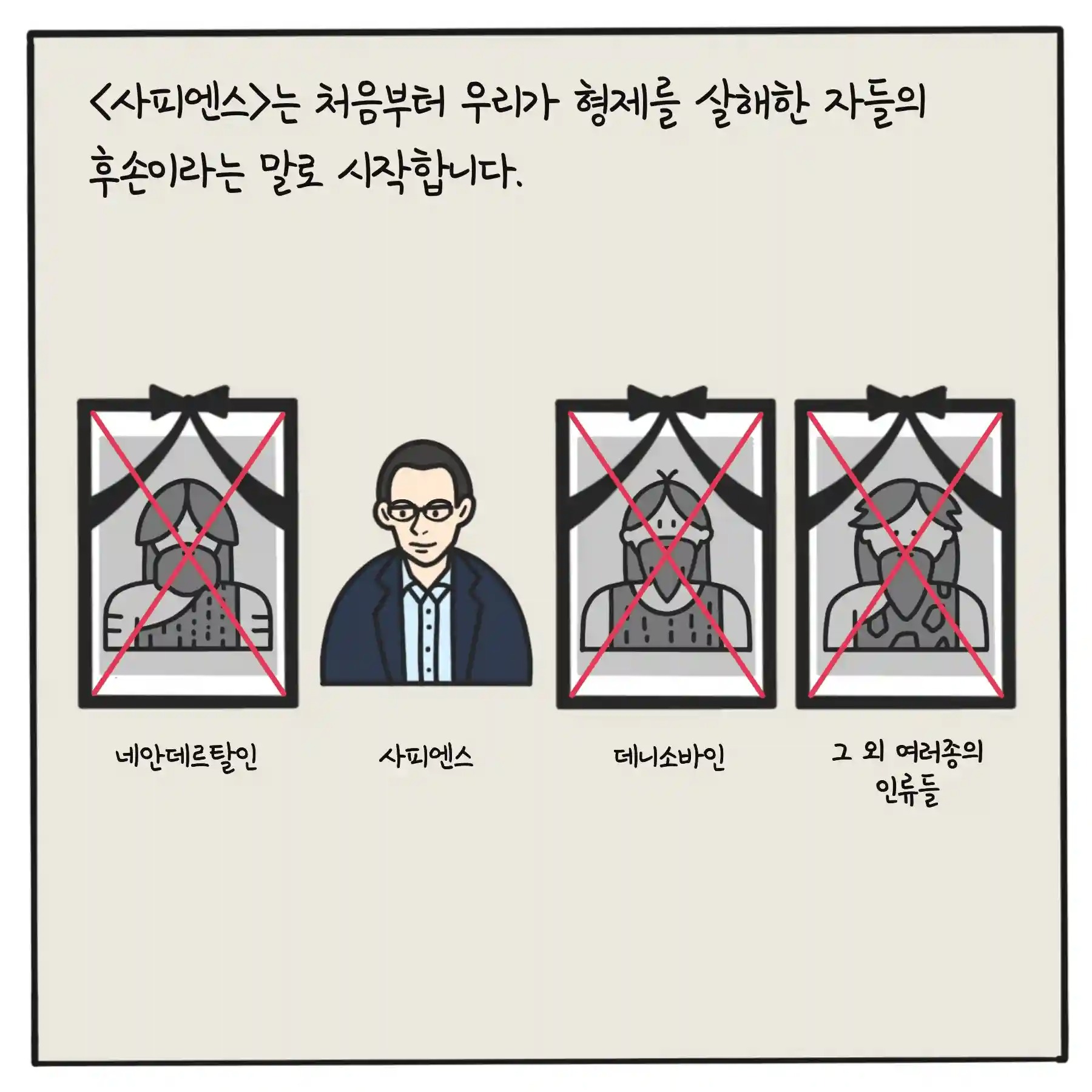 인류가 숨겨온 비밀 : 우리는 형제 살해범의 후손들호모 사피엔스 말고도 인간에 속하는 종이 적어도 여섯은 존재했었다. 하지만 현재는 딱 한 종, 호모 사피엔스만 남아있다. 호모 사피엔스가 다른 인간 종을 조직적 학살한 것을 암시하는 것일지도 모른다. 한가지 확실한 진실은, 사피엔스가 새로운 지역에 도착하자마자 그곳의 토착 인류는 멸종해 사라졌다는 것이다.