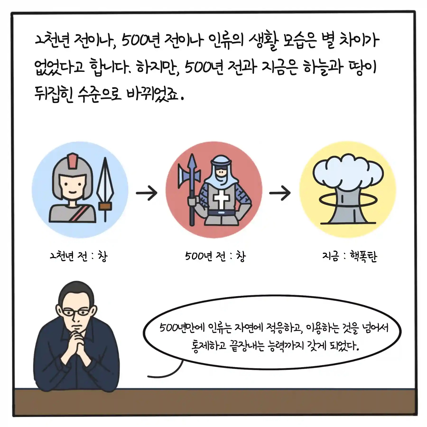 어느 날, 미국의 맬러머고도 사막에서 인류 최초의 원자폭탄이 폭발한다. 유발 하라리는 이 5백년 간의 결정적인 순간을 1945년 7월 16일 오전 5시 29분 45초라고 꼽았다. 인류가 역사의 진로를 과학의 힘으로 변화시킬 능력을 갖게 되고, 역사를 끝장낼 능력마저 보유한 순간이었다. 이제 사피엔스는 자연환경에 적응하고, 이용하는 단계를 넘어서, 통제하는 능력을 갖게 된 것이다.