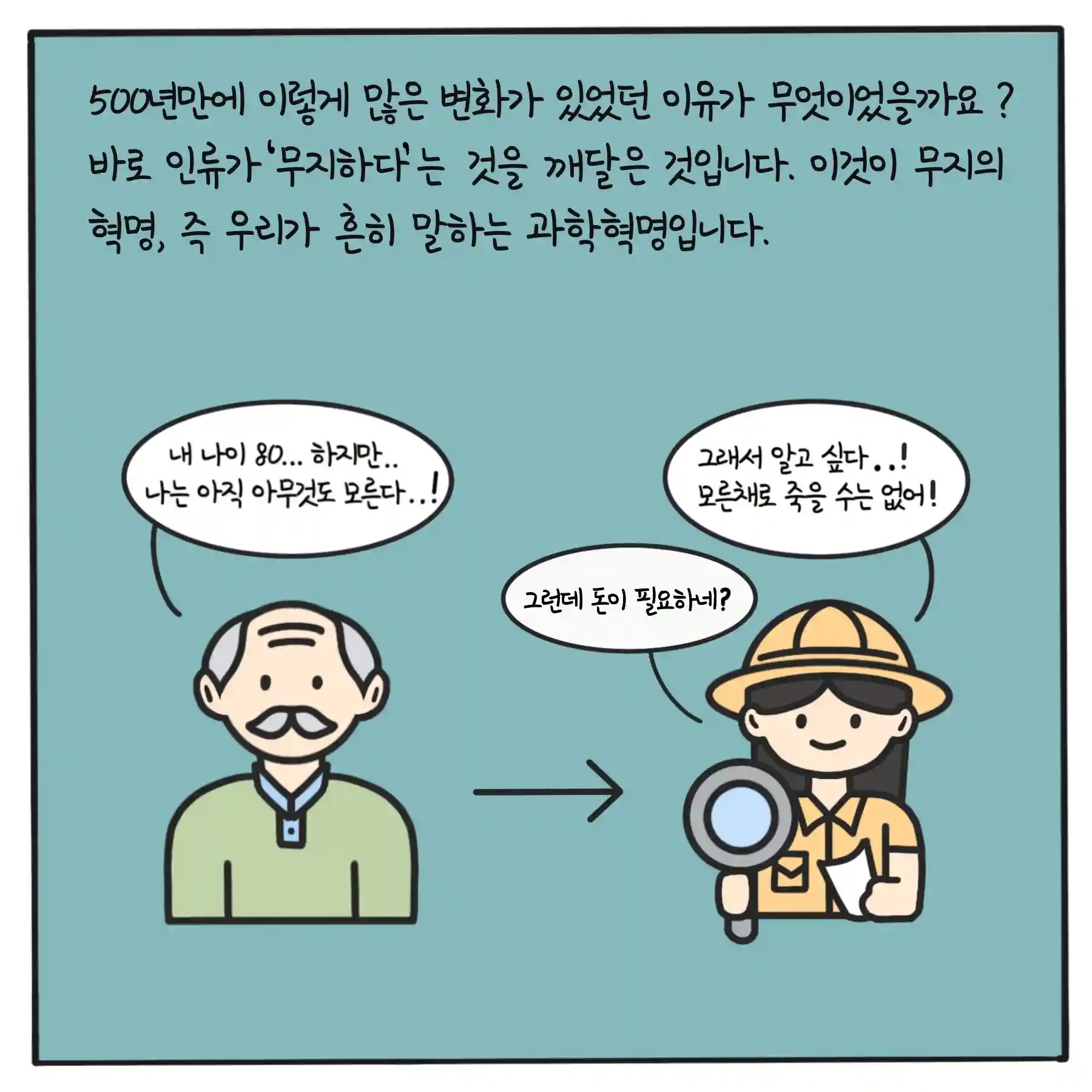 과학혁명은 인간이 스스로 무지하다고 깨닫는, ‘무지의 혁명’이었다. 유럽인들이 최초로 자신들이 아무것도 모른다는 것을 인정하였고, 알기 위해 전세계를 탐험하기 시작하며 가장 강한 지역으로 우뚝서게 되었다. 인류는 모르는 것을 점점 알게되며 사회가 진보하는 것을 눈으로 보게 되었고, 알아가는 것이 곧 ‘성장’과 직결되는 것을 깨닫게 된다. 실제로 이 시기에 인류는 엄청난 성장의 속도를 보여주었다. 1500년 경 호모 사피엔스의 숫자는 5억명이었으나, 오늘날에는 78억명에 달한다. 하지만 과학연구는 돈이 필요했으며, 결국 모르는 것을 알고 싶다는 욕망은 돈이 더 필요하다는 욕망으로 이어졌다.