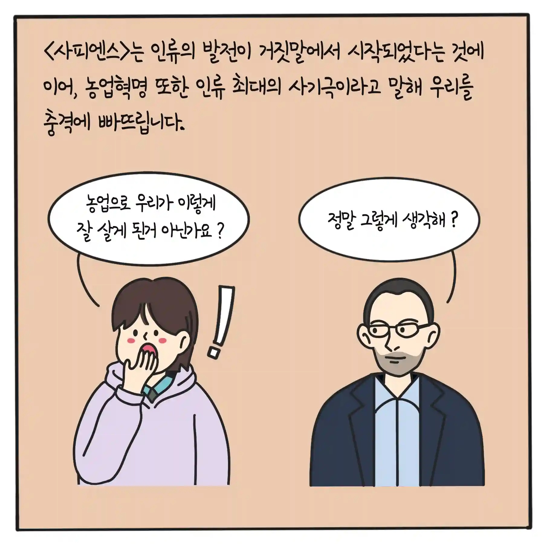 역사상 최대의 사기1만년 전부터 사피엔스는 동물과 식물을 잡기보다, 그들의 삶을 조작하는데 시간과 노력을 바치기 시작했다. 이렇게 인간이 수렵, 채집에서 벗어나 농업을 시작한 것을 두고 역사는 ‘농업혁명’이라 칭한다. 하지만 농업혁명은 안락한 삶보다는, 더욱 힘들고 불만스러운 삶을 선사했다. 농업혁명 덕분에 인류가 가진 식량의 총량은 늘어났으나, 식사의 질과 여유시간은 줄어든 것이다. 수렵과 채집 생활에서는 4~6시간 정도면 온 무리가 먹고 사는 것이 가능했으나, 농부는 온종일 열심히 일해야만 했기 때문