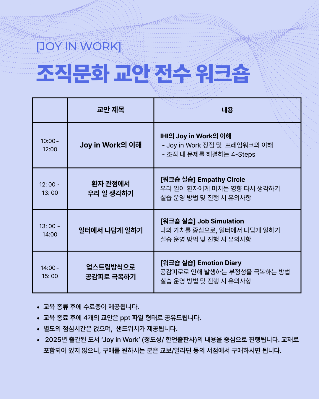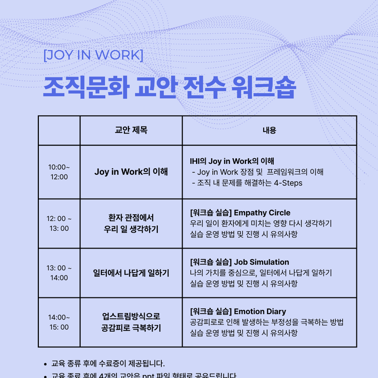 이번 과정에서는 Joy in Work의 핵심 이론뿐 아니라, Empathy Circle,·Job Simulation·Emotion Diary 등 병원 직원 교육에서 효과가 입증된 다양한 실습 콘텐츠를 직접 체험하고 운영하는 노하우를 습득합니다.